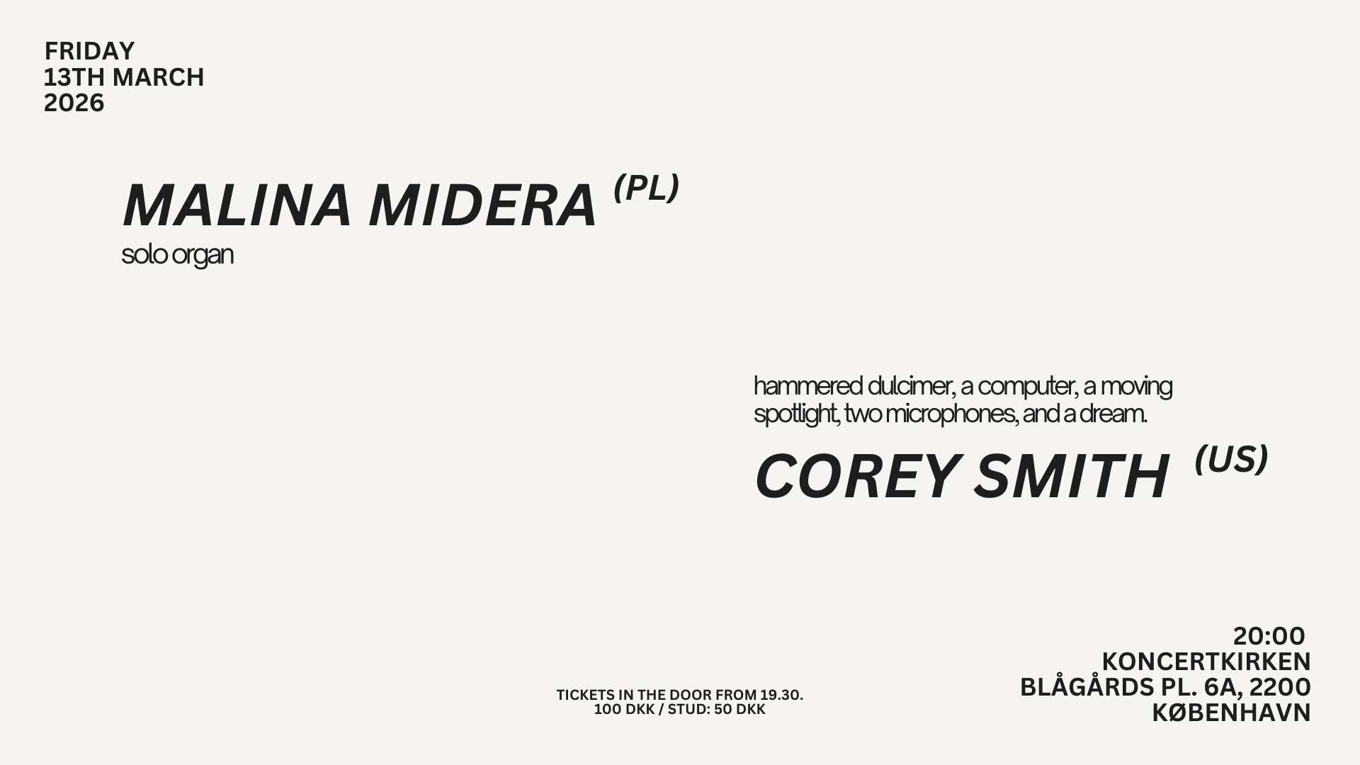 Malina will present several organ pieces composed last year, which will appear on her upcoming solo release. The program blends composed material with improvisation, creating a dialogue between structure and flow. In her organ works, Malina explores a minimalist approach to improvisation, focusing on subtle textures, repetition, and the playful sonic possibilities of the church organ.