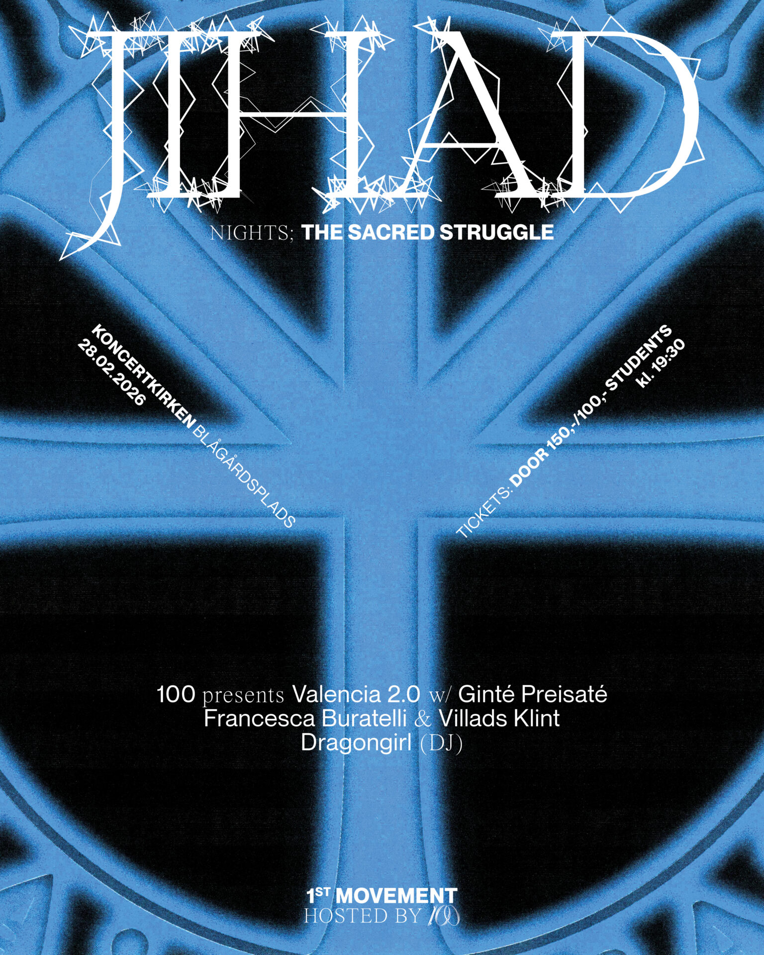 Denne aften markerer første sats af Jihad Nights: The Devine Struggle I centrum står Valencia 2.0 af den tunisisk-danske kunstner og komponist 100.miia (Mia Ghabarou). Værket blev oprindeligt bestilt til Organ Sound Art Festival 2025, men blev udsat på grund af sygdom og realiseres nu fuldt ud i denne udvidede koncertsammenhæng.